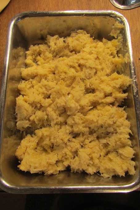 にんにくとタラと塩、黒胡椒、ローリエをごりごりすり鉢ですって、、、