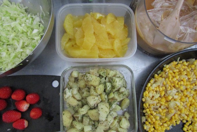 千切りキャベツ、河内晩柑、カスタード、サワークリームコーンパイ、新ジャガ、、、、、