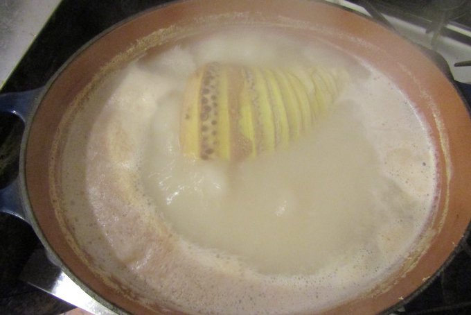 丸々1時間、米ぬか風呂に。タケノコのアクを抜いてるところ。