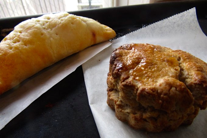 手前が「蕎麦粉×メープルシロップのスコーン」。奥は「いちぢくクリームチーズパイ」